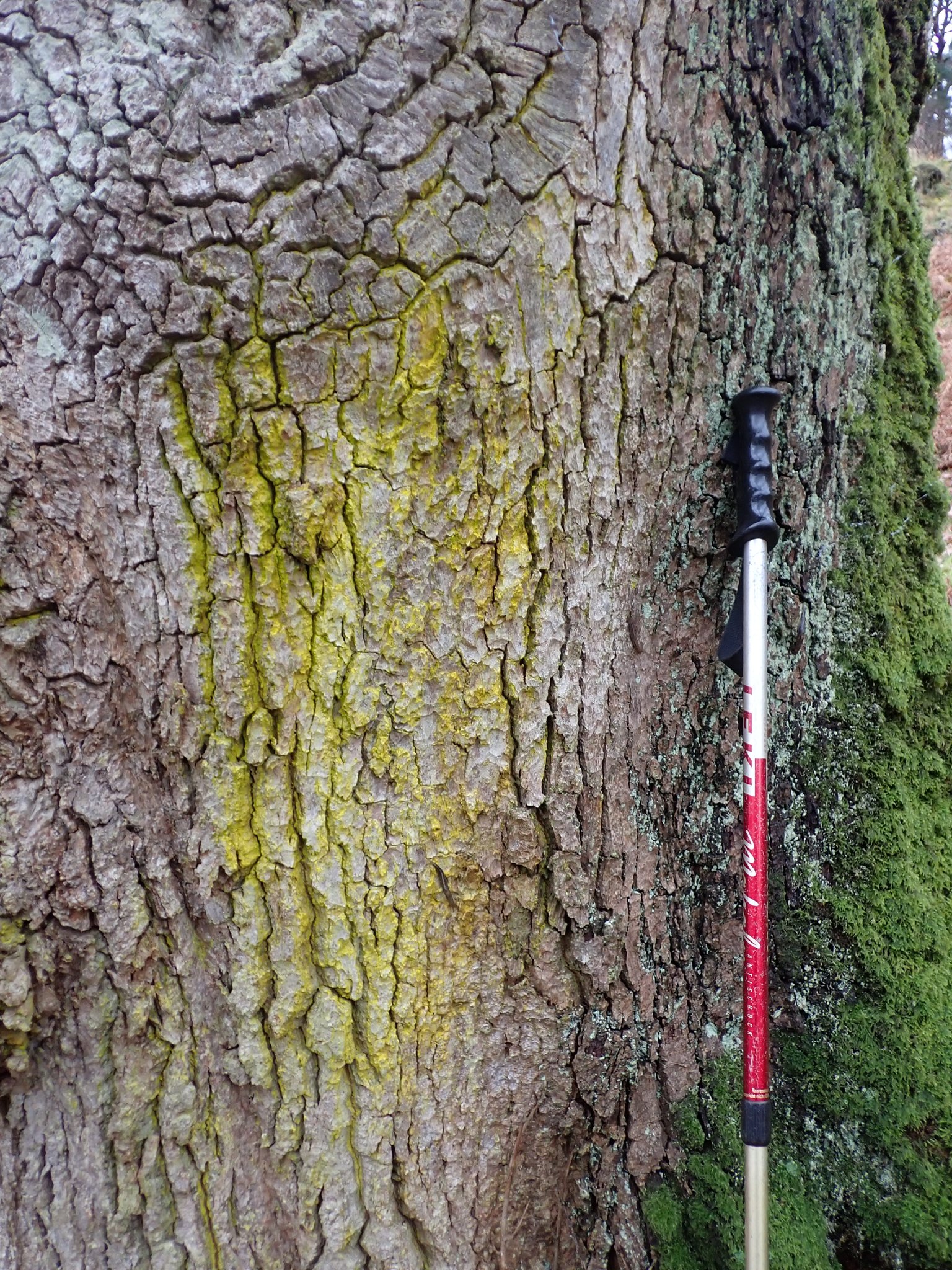 The drier side of the Oaks began to have more Lecanactis abietina: the purpley-grey thallus has white-tipped pycnidia that go red with C. There was Chrysothrix candelaris too- yellow streaks that look like spray paint. A loud rush surprised me- dozens of Wood pigeons landed in the canopy nearby. Nuthatches called.