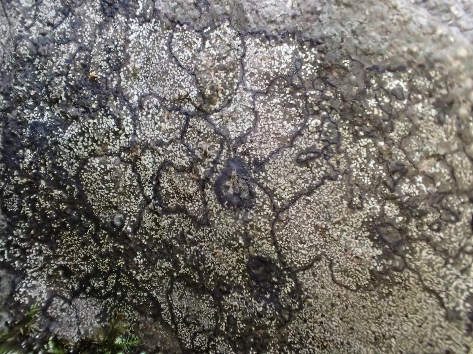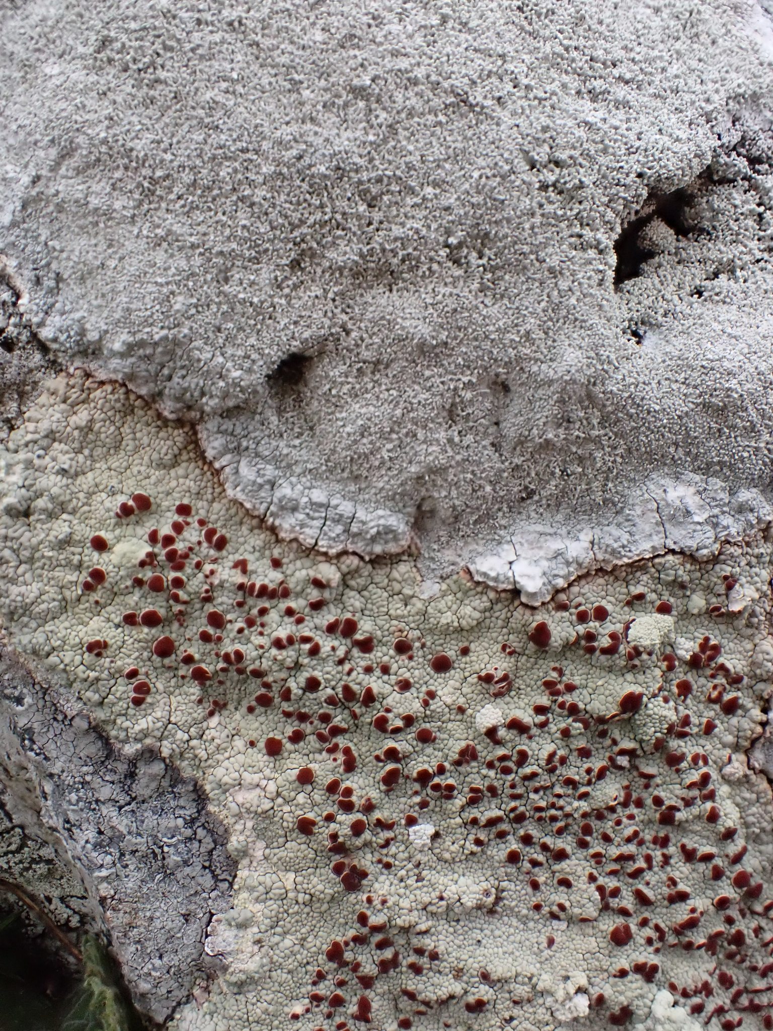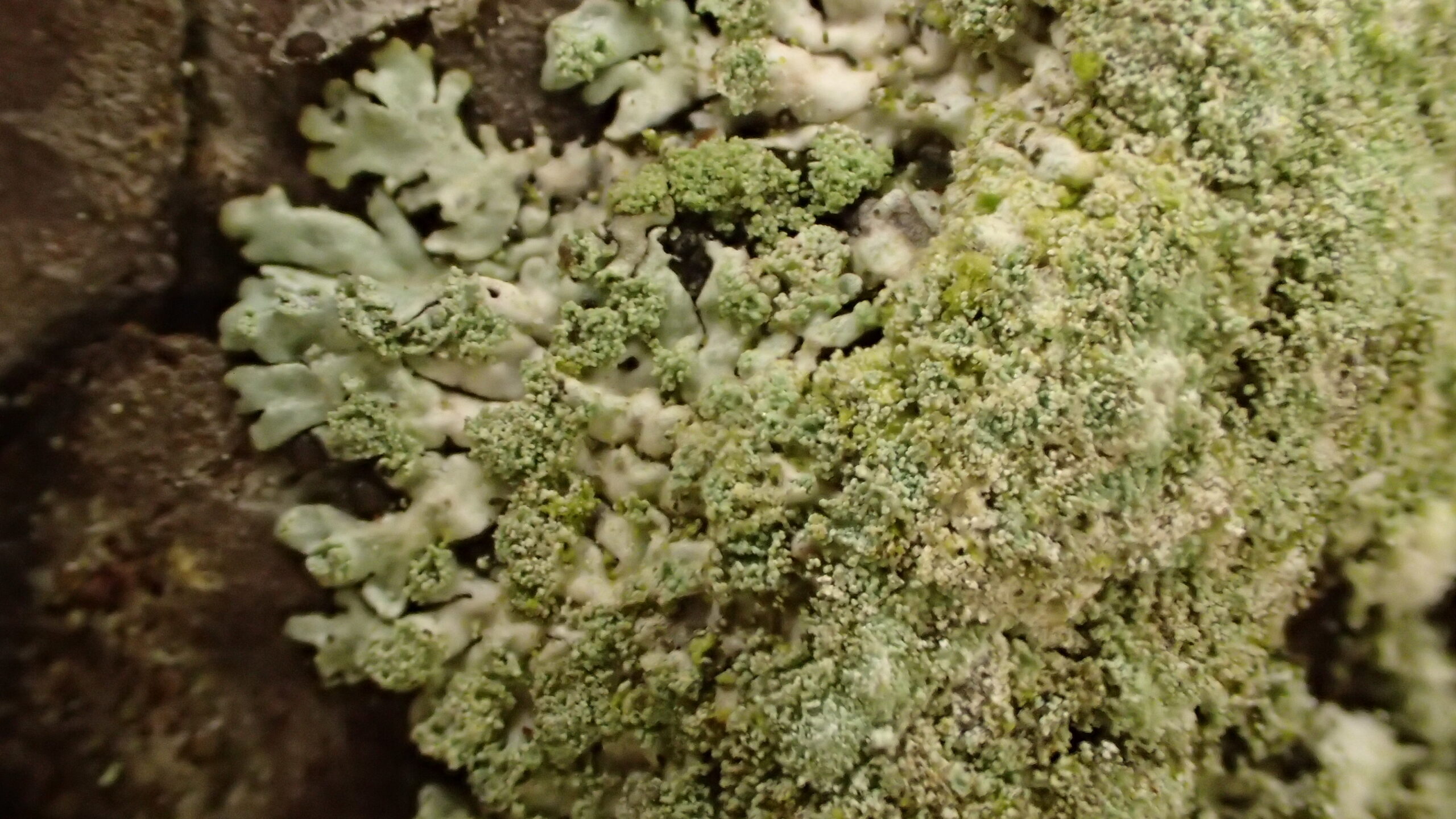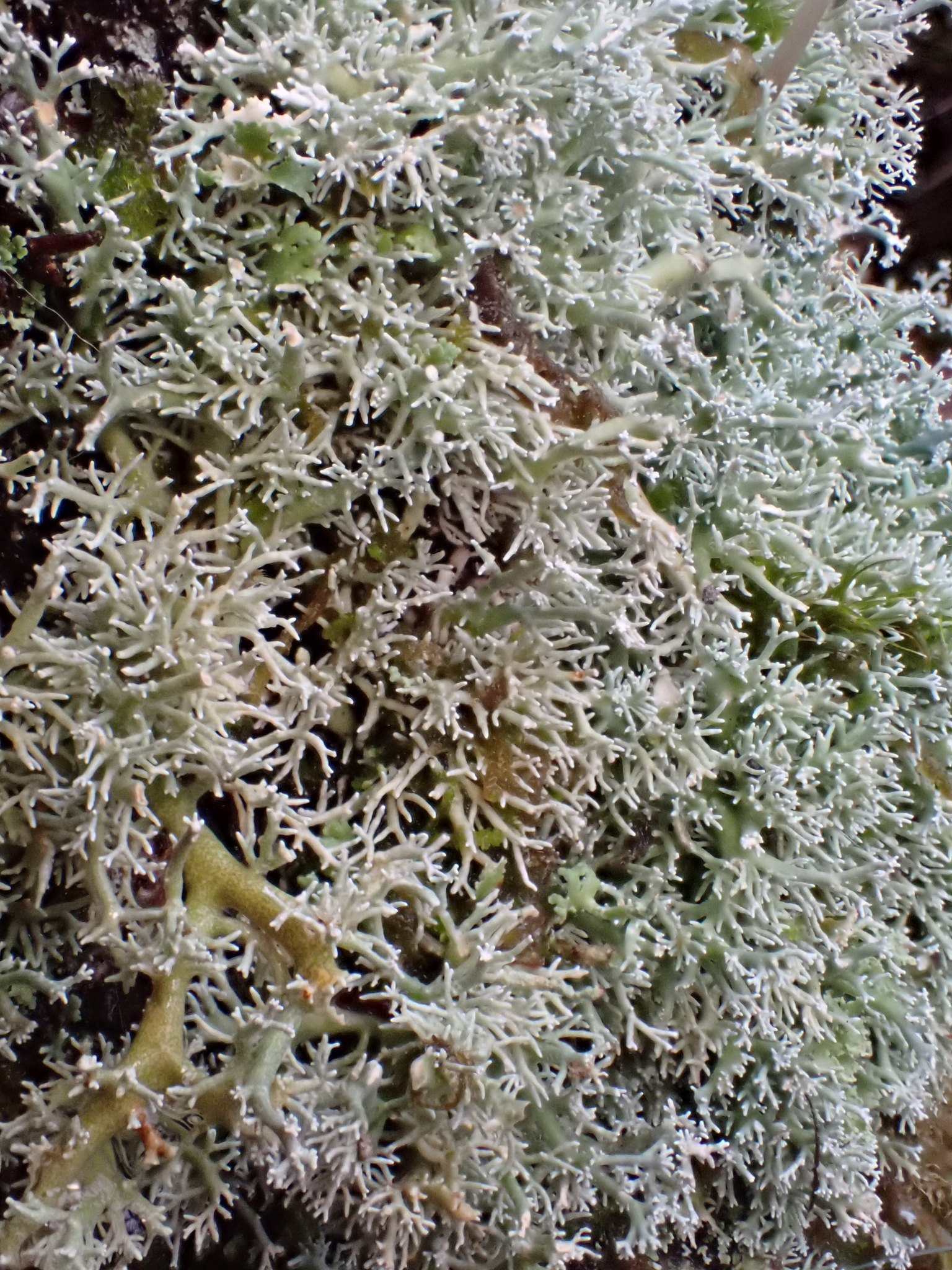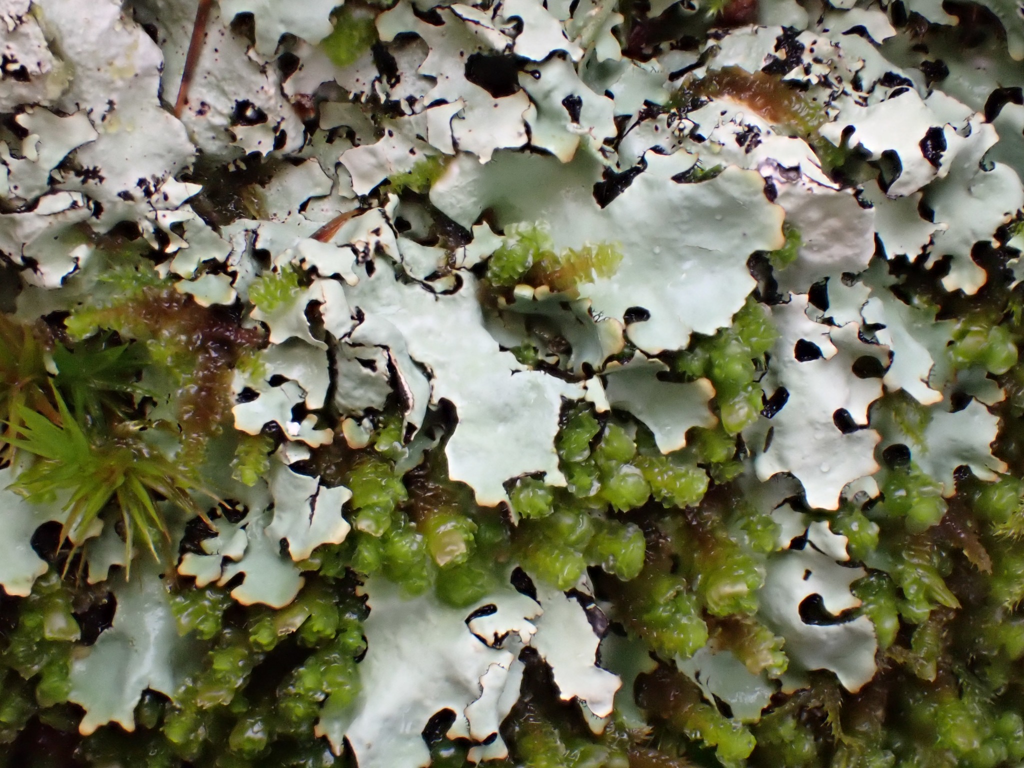Higher still there was a rosette on the moss on the ground- Hypotrachyna taylorensis. Always an interesting species as it has no fruiting bodies or apparent asexual reproductive structures. It must spread by just having bits break off. This was a healthy looking patch but…where had it come from? We looked around suspiciously, but failed to find the source.