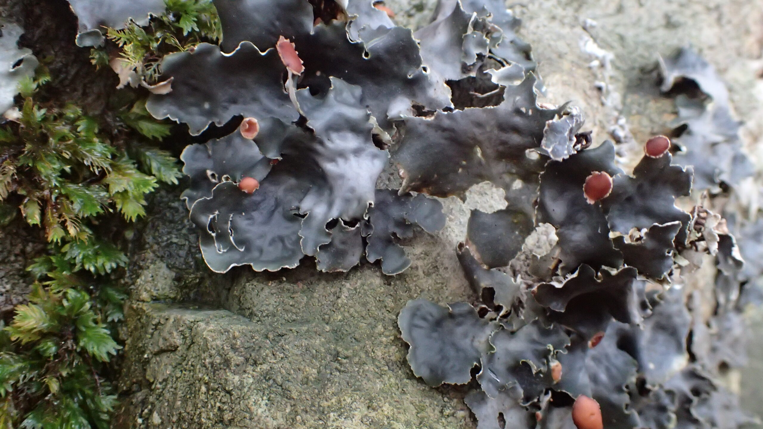 Caz had found Leptogium cyanescens in 2019 on the lowest outcrop.  Close examination found two other jelly lichens- Collema glebulentum and Scytinium lichenoides, but no cyanescens. Peltigera horizontalis was found just along the crag. We edged our way up and had lunch.