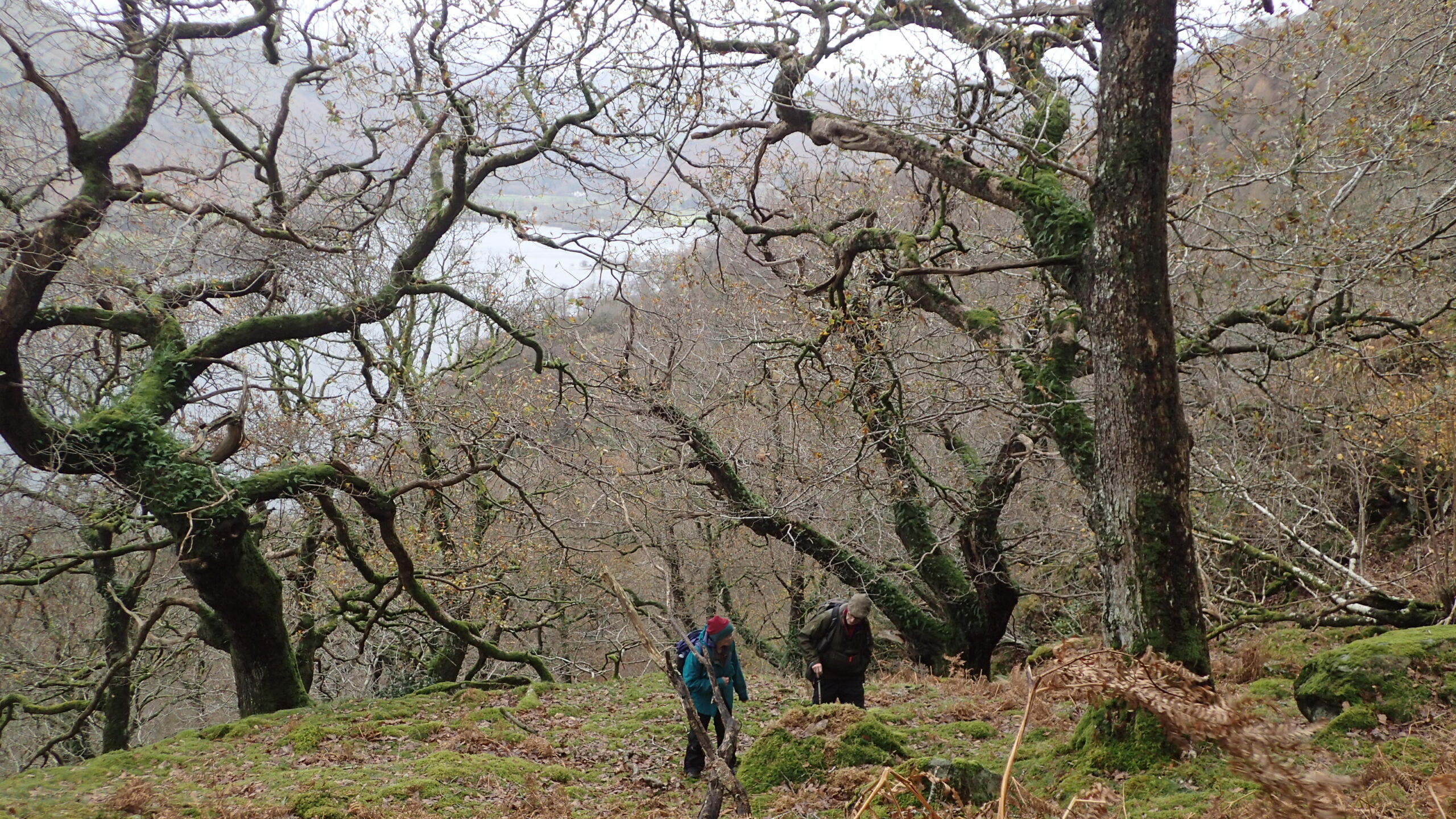 For some reason, there’s been relatively little recording of the lichens in Glencoyne Wood, despite it being close by the relatively well-known hotspots of Glencoyne Park, Aira Force and Yew Crag. Chris and Caz’s recce had included the northern side, overlooking the delightfully-named Seldom Seen. They had found Ricasolia virens, Pachyphiale carneola and Nephroma parile. So I was hoping for a bit of Lobarion. The thick-trunked old Oaks at the bottom of the slope looked promising.