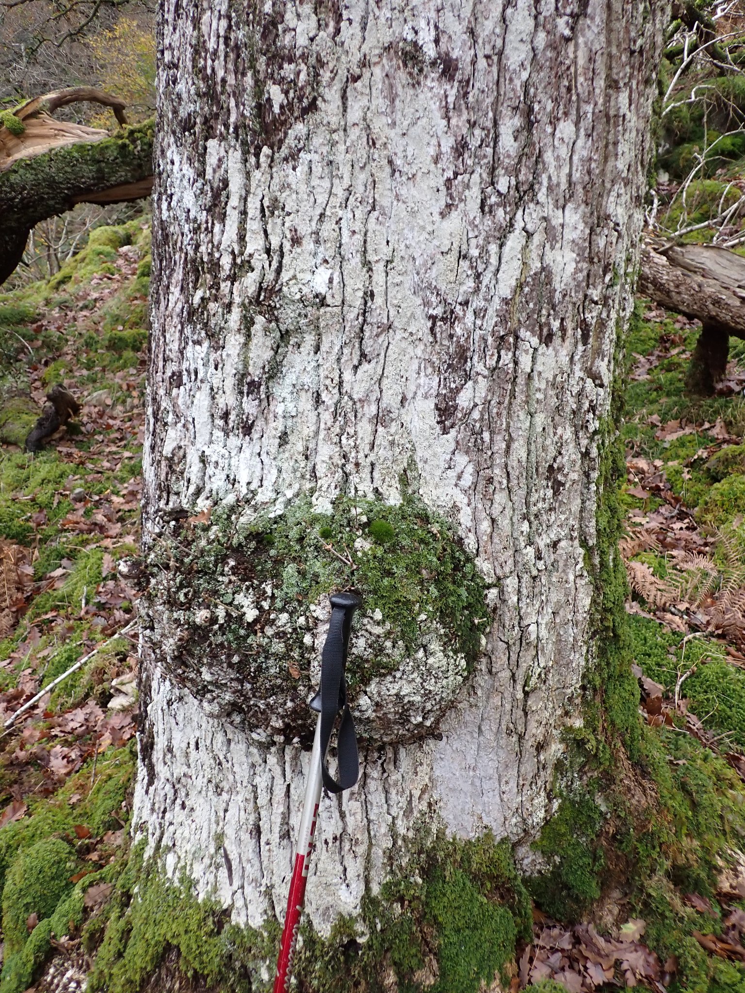 Quickly, we found Thelotrema– the first I looked at had yellow under the apothecia and went red with K so I called it as T. lueckingii. There was lots of Thelotrema. Lots and lots. Other white splats on the mostly wet trunks included Pertusaria pertusa and P. hymenea. Foliose trunk species included Parmelia saxatilis and Melanelixia glabratula. The Hazels had some good thalli of Graphis scripta s. lat, and a Birch had Hypotrachyna laevigata. But mostly the trees were Oaks, thick-trunked Oaks with more Thelotrema than I could shake my stick at. But it wasn’t on all the oaks: on one “Thelotrema-free” tree we found- and discussed- the white pycnidia of Micarea stipitata. And were those apothecia?