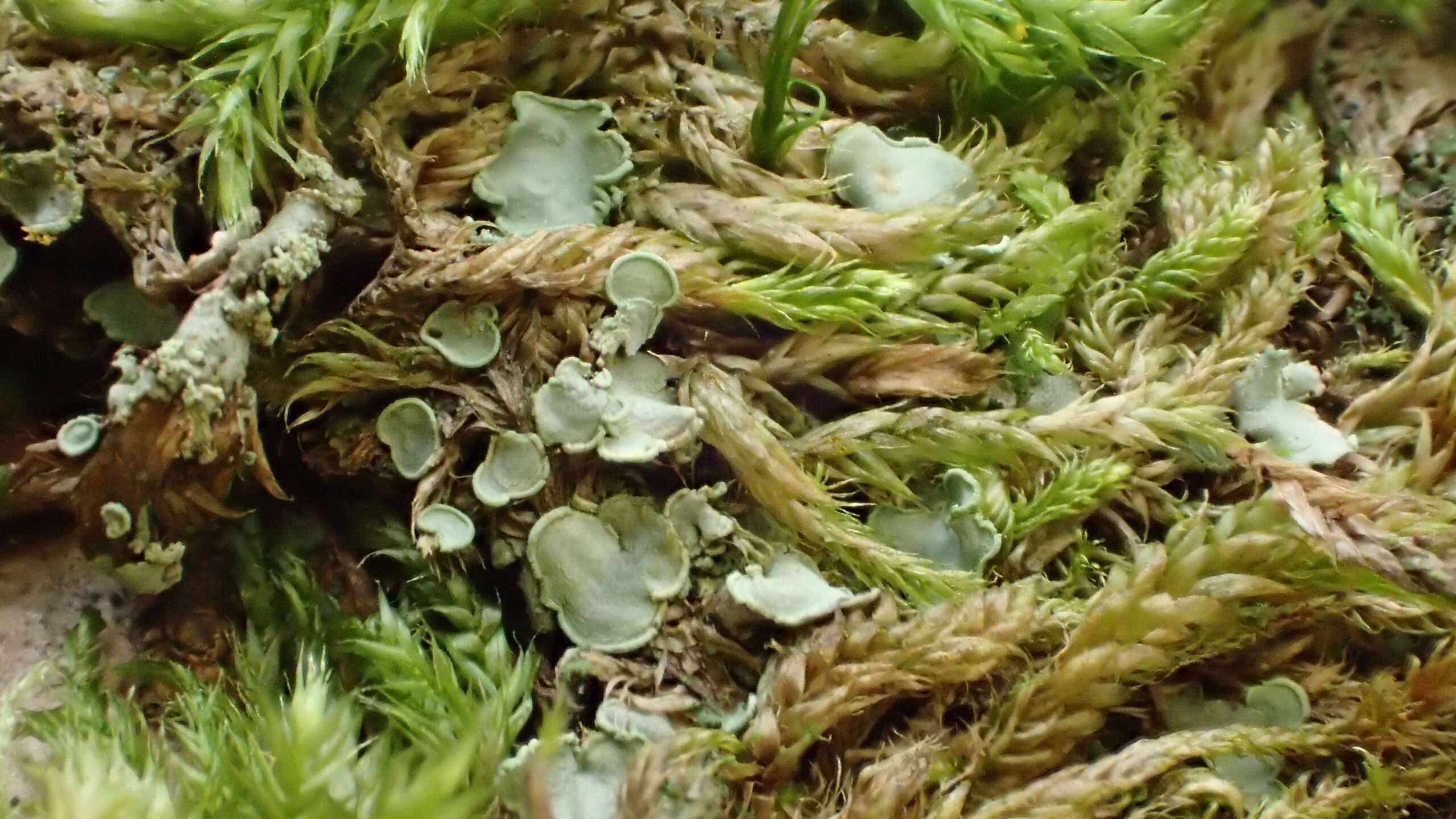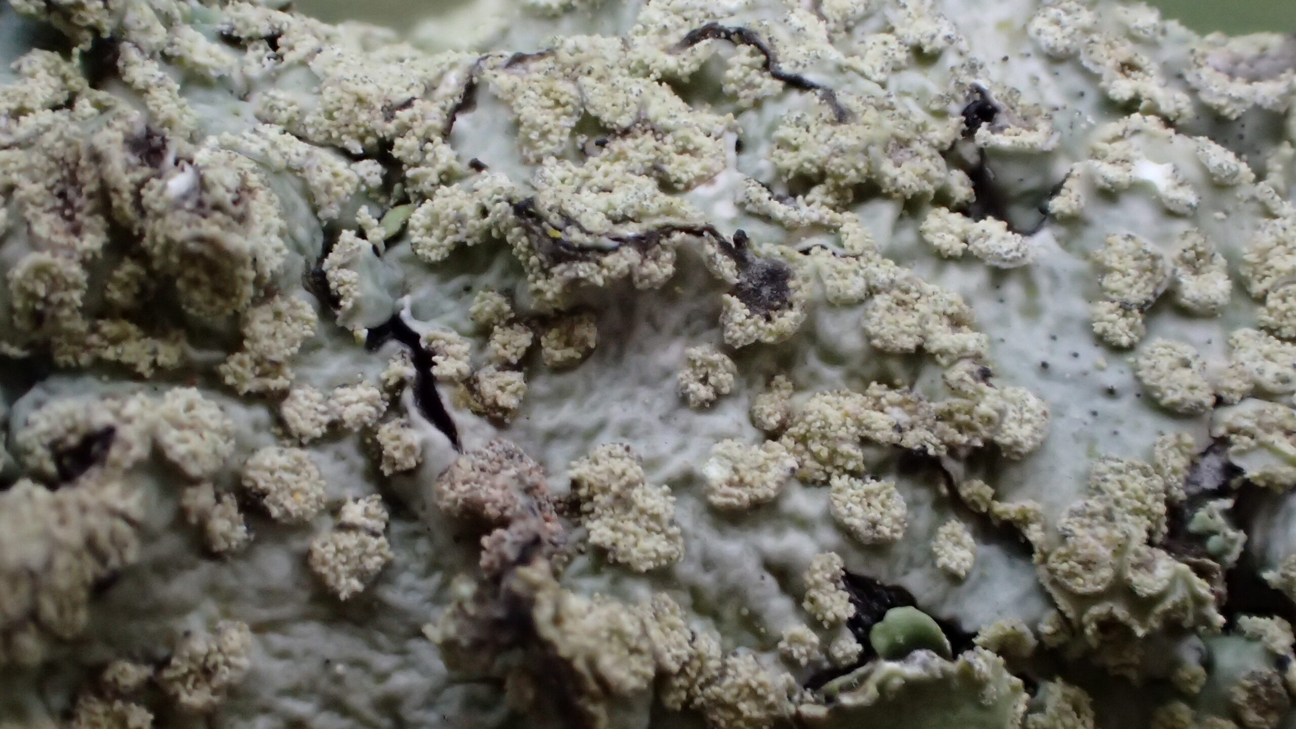 We moved reasonably quickly (for us) downhill and over to the other side of the valley (but stayed in the same grid square). More widely spaced Oaks and Ashes provided the first Hypogymnia of the day, and a few more fairly common species. Less common were Normandina chlorococca (tiny black eyeball-like perithecia protruding from green squamules) on one of the Ashes and the tiny jelly lichen Scytinium subtile that eagle-eyed Caz found on another. Chris found a mouse in a tree.