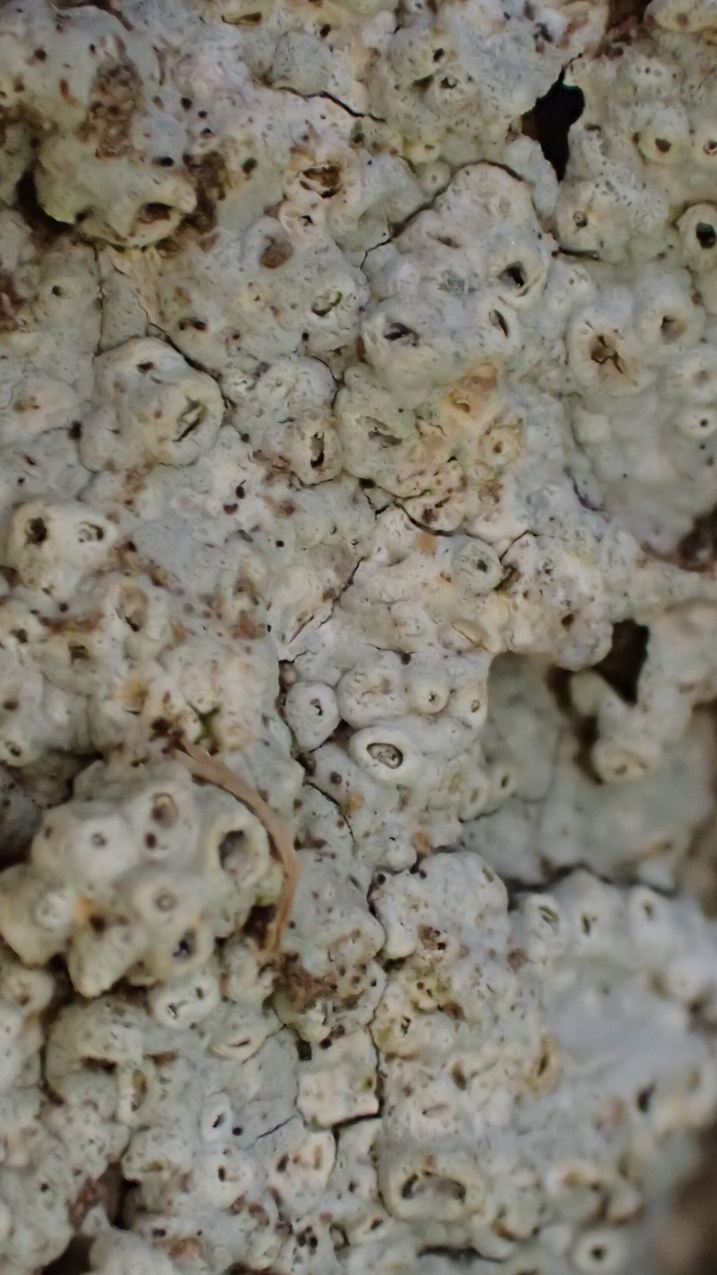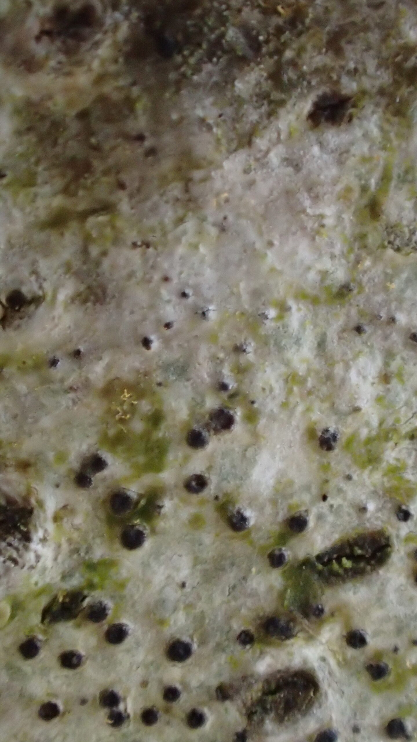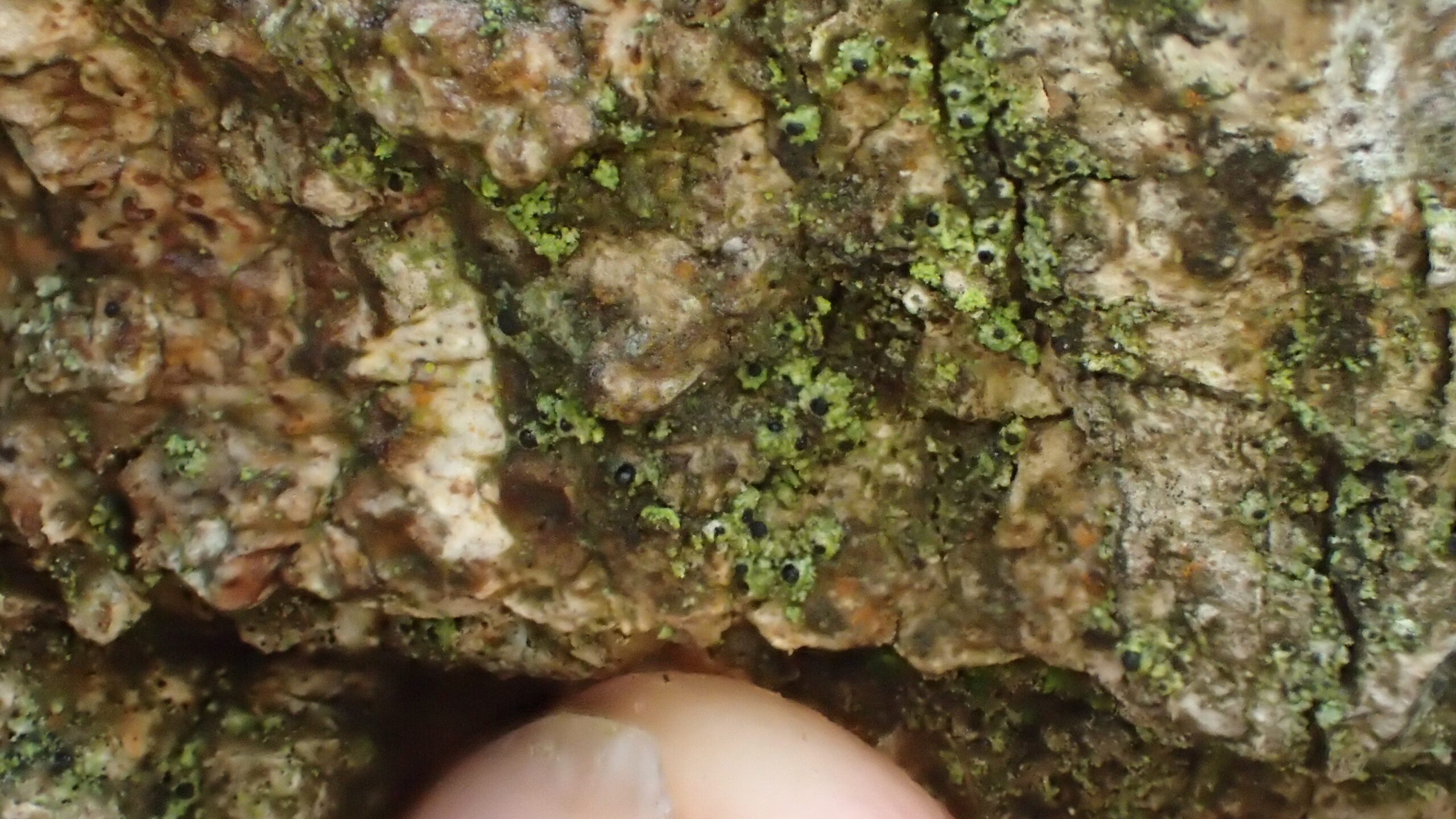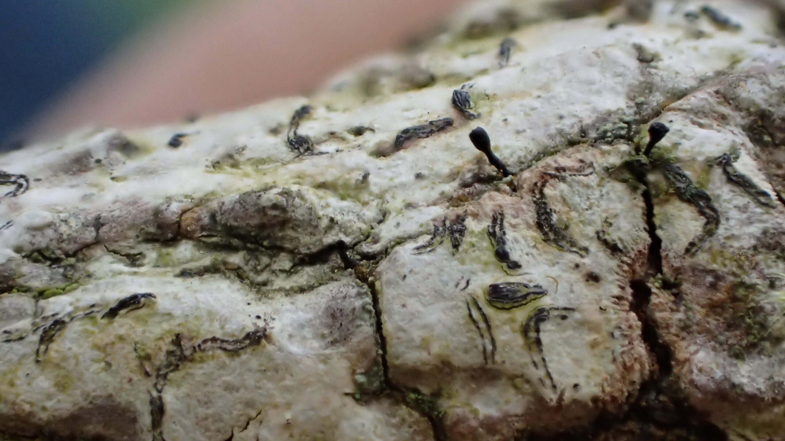 As we moved higher up through the wood we found more white splats of Pertusaria and Ochrolechia species. There were the multi-furrowed lirellae of Graphis elegans; the tiny conical and pointed pycnidia of Anisomeridium polypori. We stopped for lunch just below a low fence. The rain started.