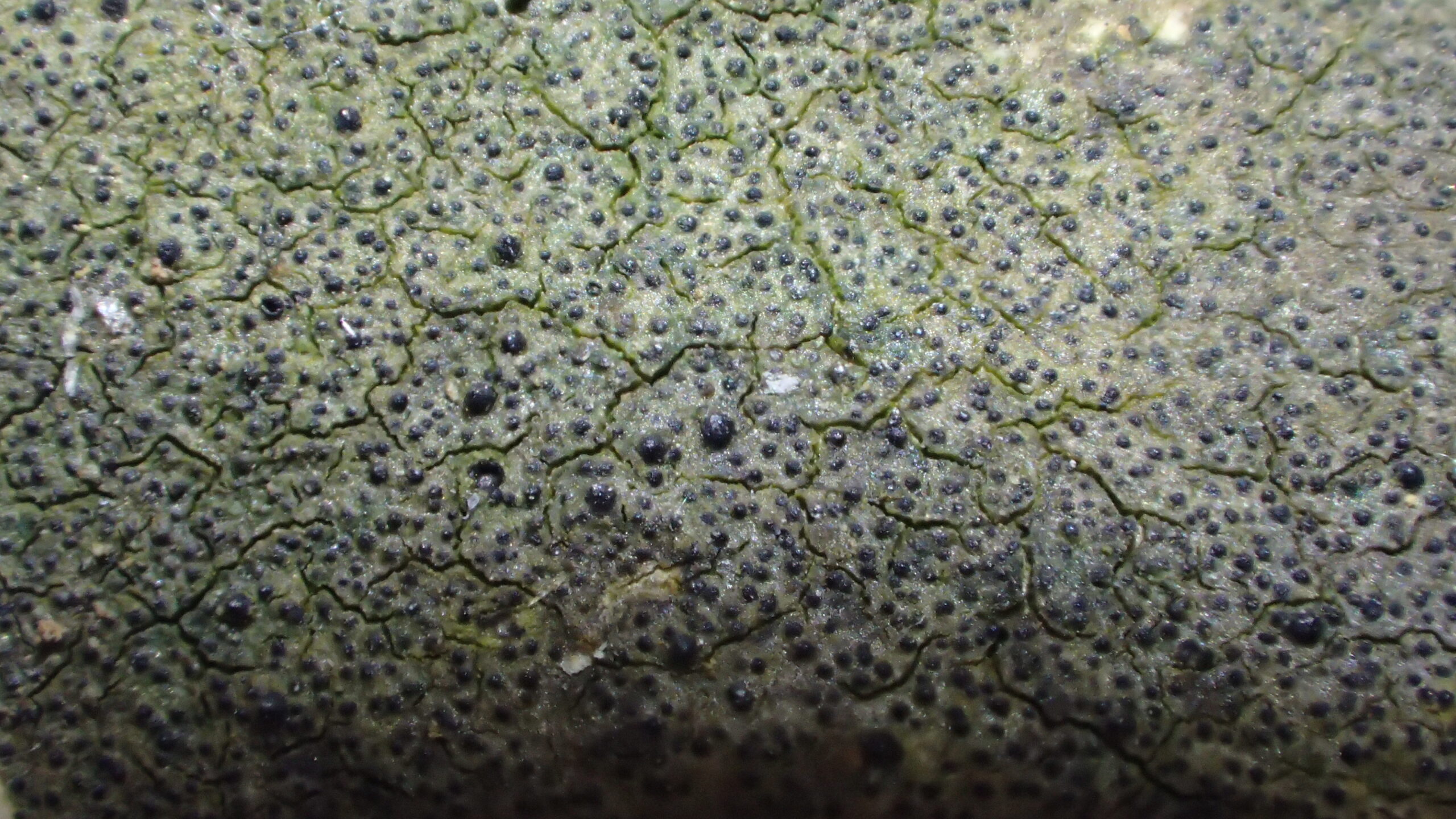 We quickly got to grips with the common macrolichens for the day: Hypotrachyna revoluta and afrorevoluta, Parmelia sulcata, Ramalina farinacea, Punctelia subrudecta. There was Normandina pulchella aplenty and several of the lirellate species that used to all be lumped together as Graphis scripta. A number of the often-poorly-from-dieback Ashes had Peltigera horizontalis, which was nice to see, though there was more P. praetextata and membranacea as one might expect. There was Stenocybe pullatula on the Alders; the tiny little pin-like fruiting bodies of one of the non-lichenised fungi that are recorded traditionally by lichenologists. Its cousin, S. septata was on at least one of the older Hollies. There didn’t seem to be that much of interest on the Hazels, as they appeared very mossy, even though they are pretty old. We did find Thelotrema lepadinum on one though. And there was a nice example of Coenogonium luteum’s apricot apothecia on another.