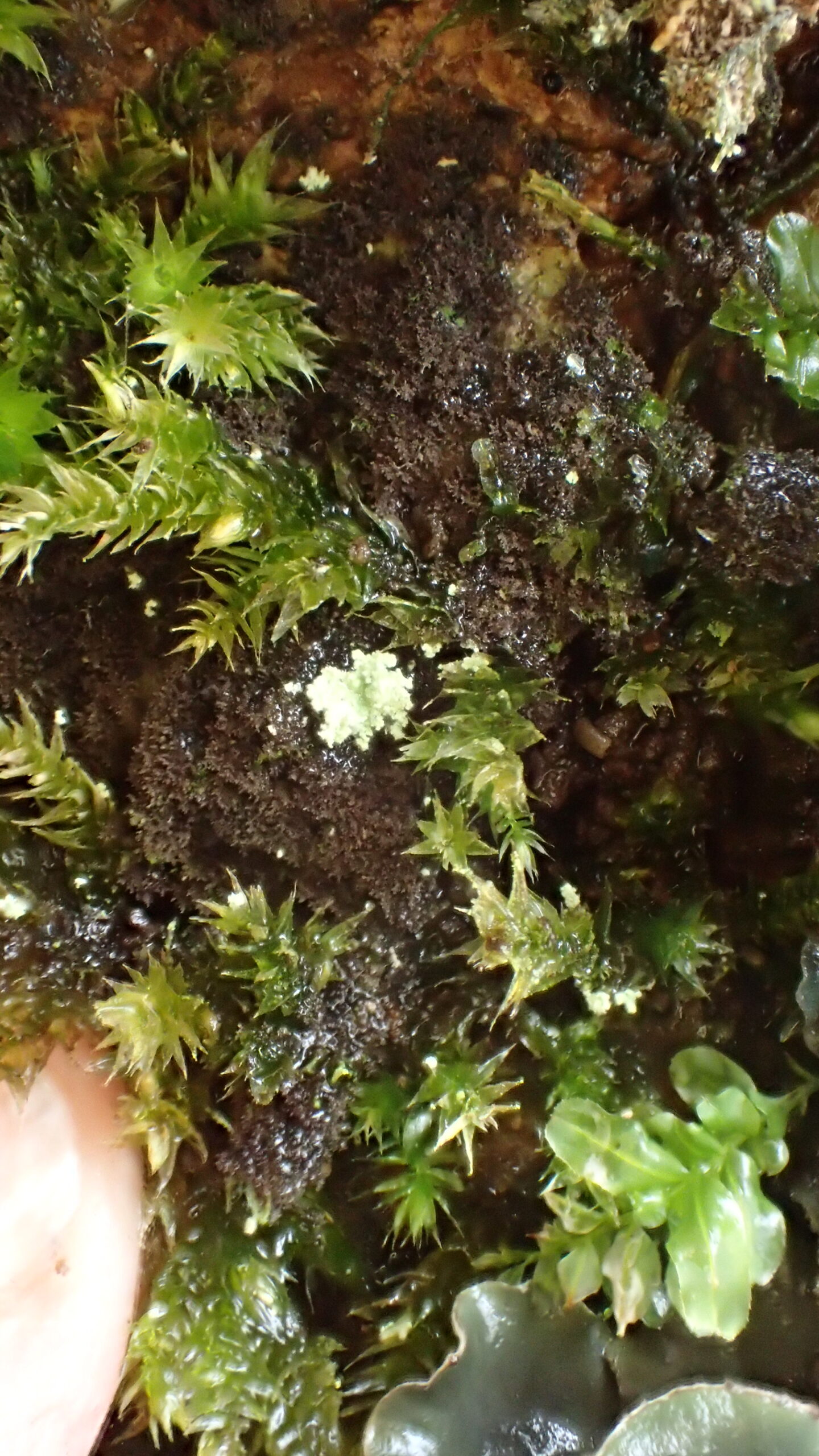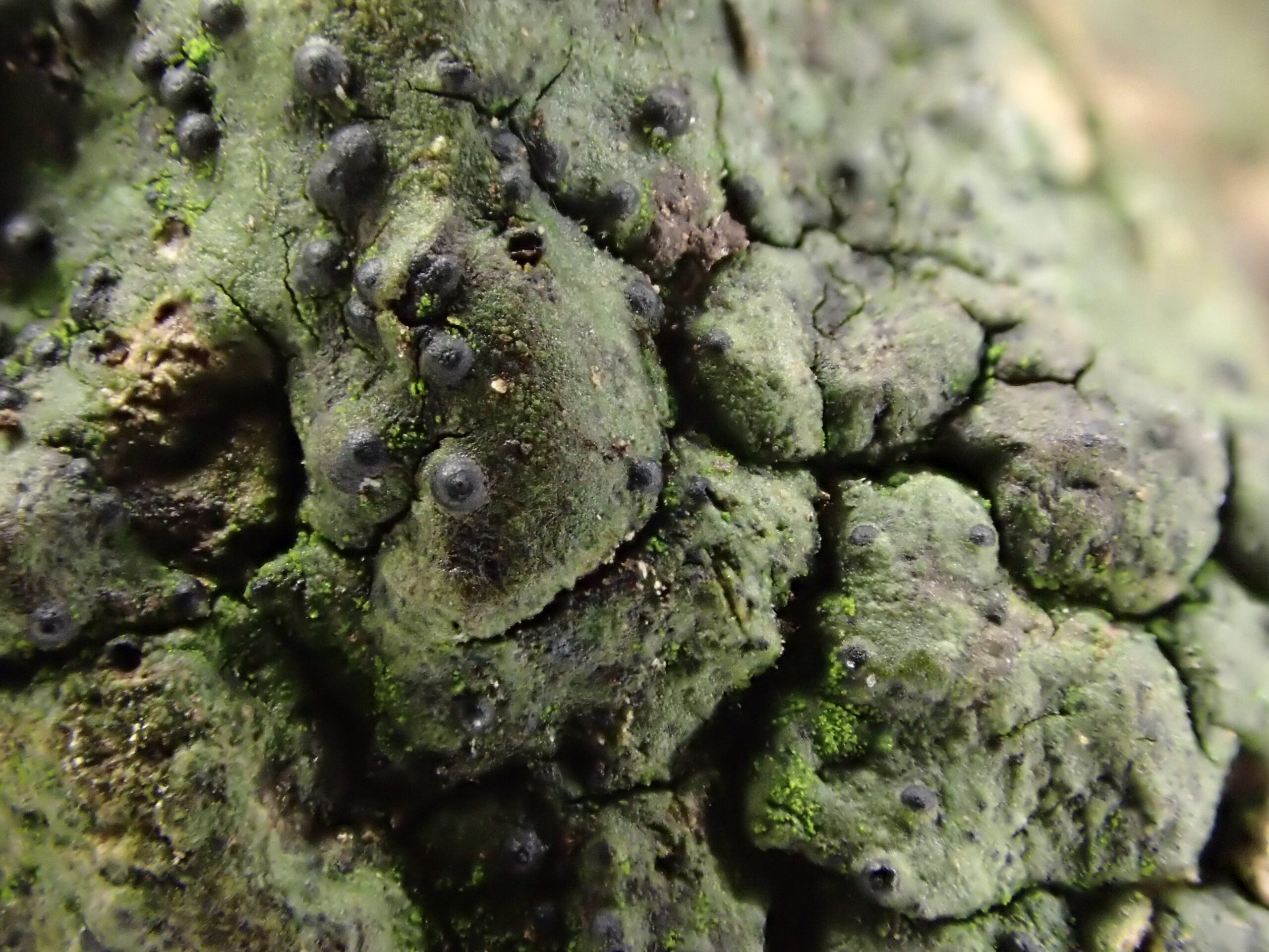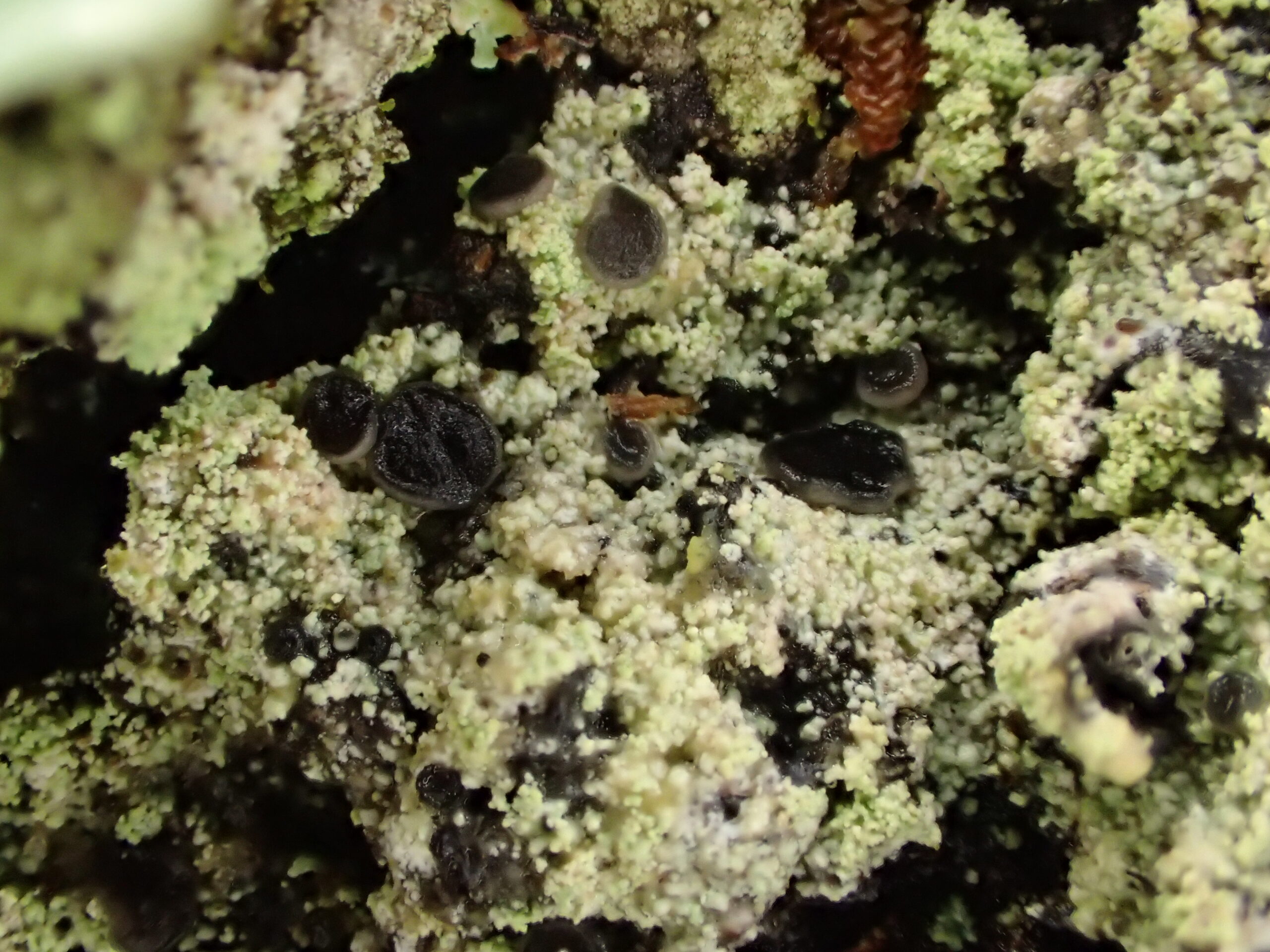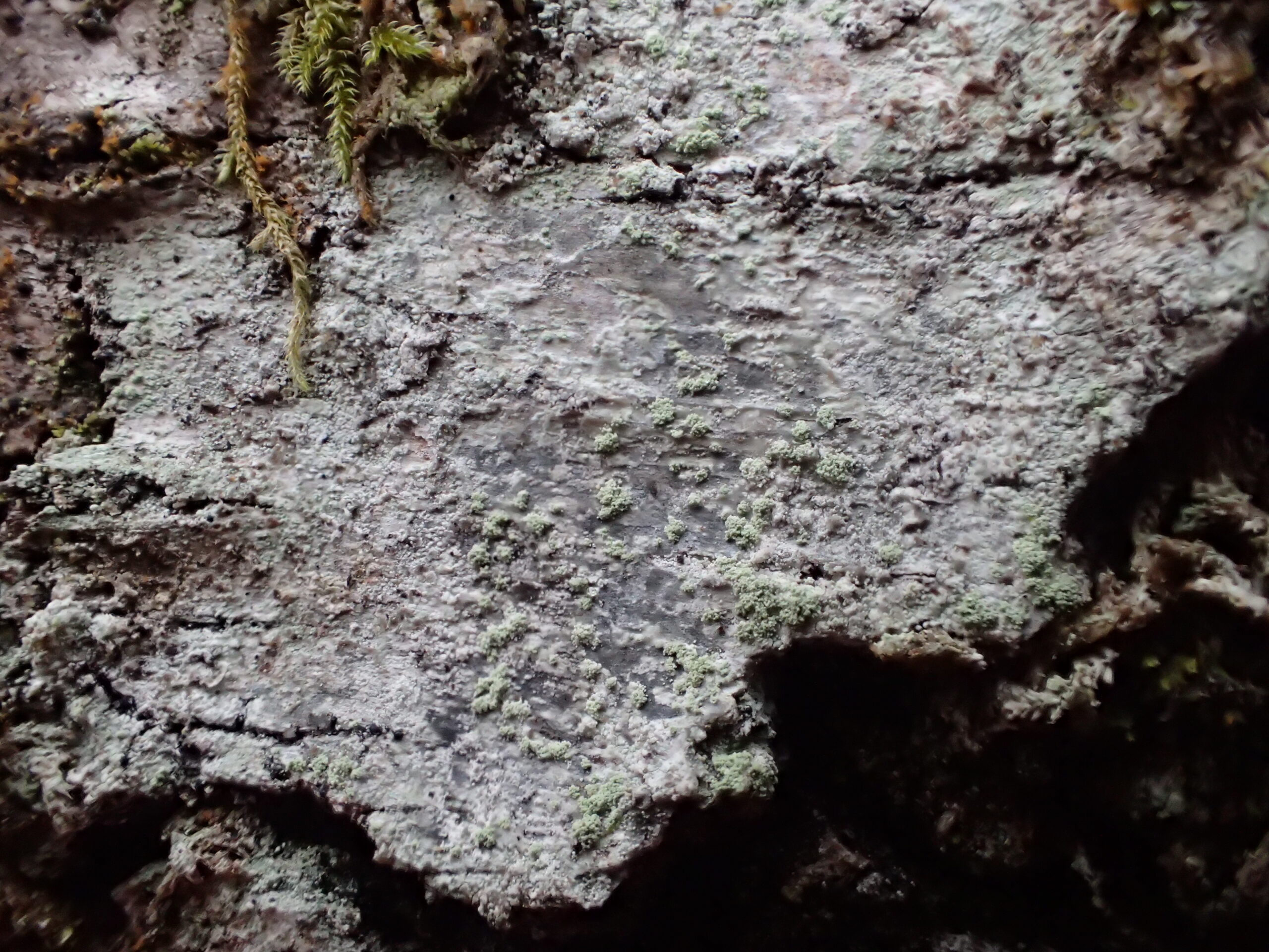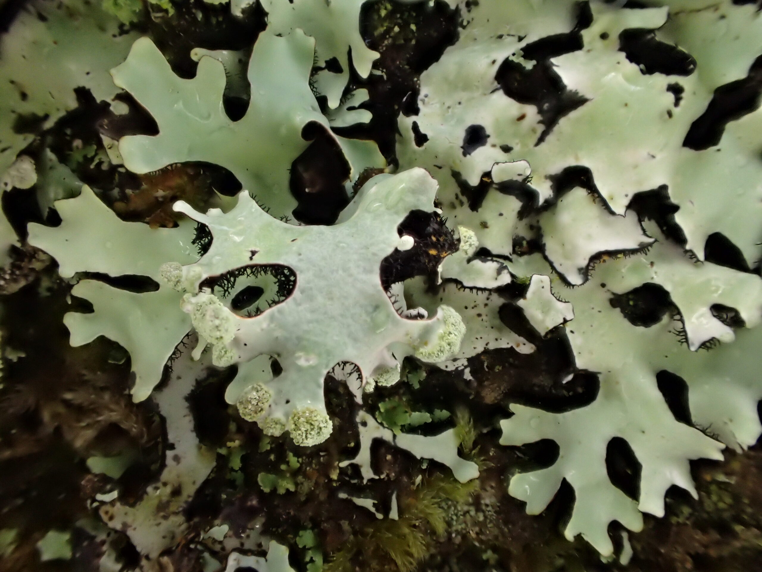 The bryophyte people had been looking at the beck and Ryan had seen green Peltigera leucophlebia, with distinctive cephalodia (warts on the upper surface containing cyanobacteria which fix nitrogen). This is another indicator of at least some base richness. Nearby birch had lovely acid bark species – Megalaria pulverea (pale yellowish granules and dark apothecia with a pale rim, K+yellow), Mycoblastus caesius (scurfy thin thallus with soredia but bright in UV) and Hypotrachyna laevigata (a beautiful foliose lichen with pearly blue-grey lobes, distinct round axils and blobs of soredia only at lobe tips).