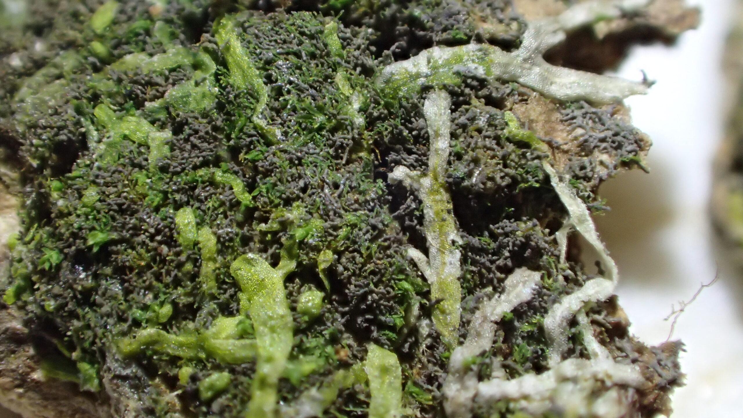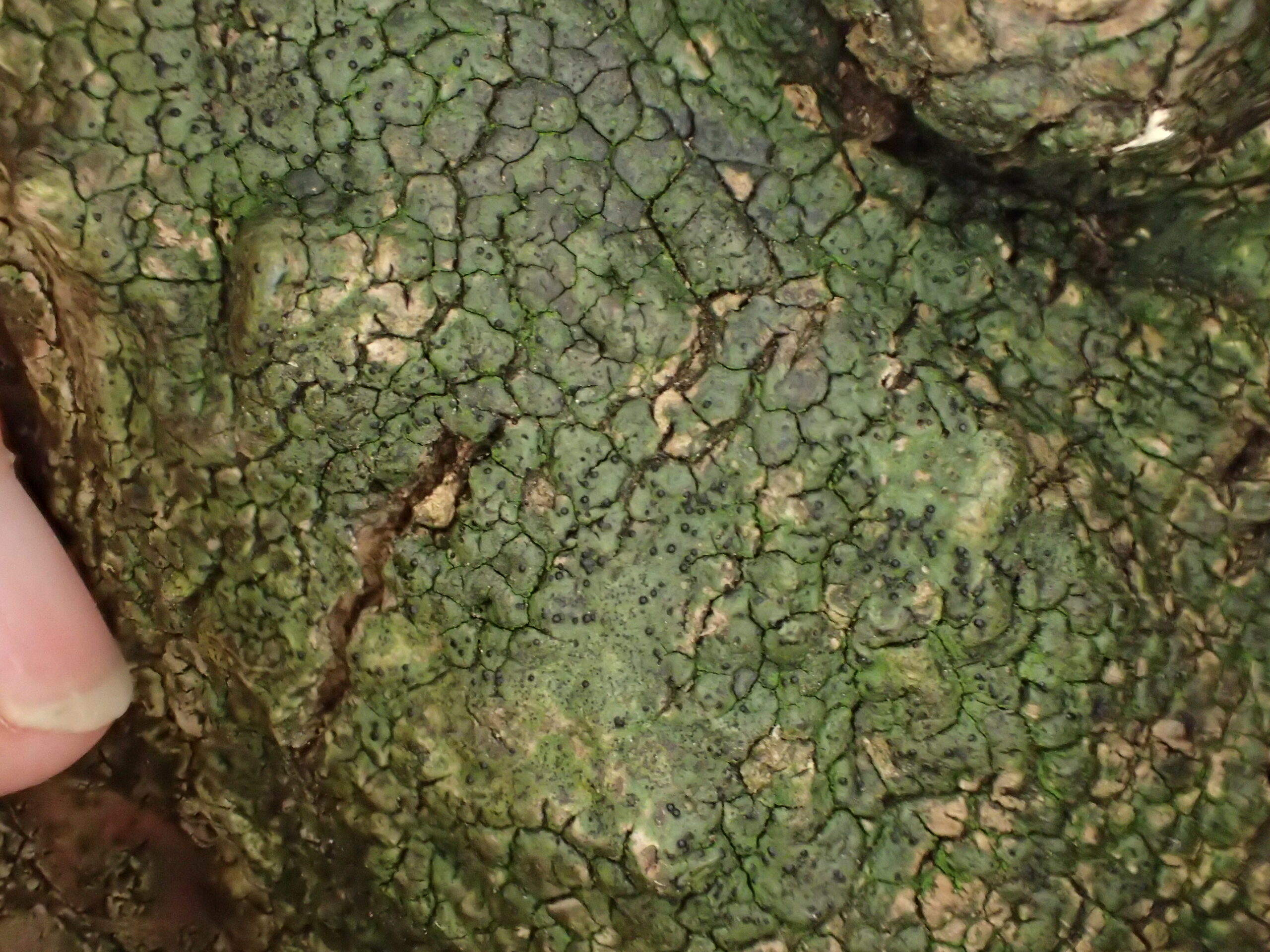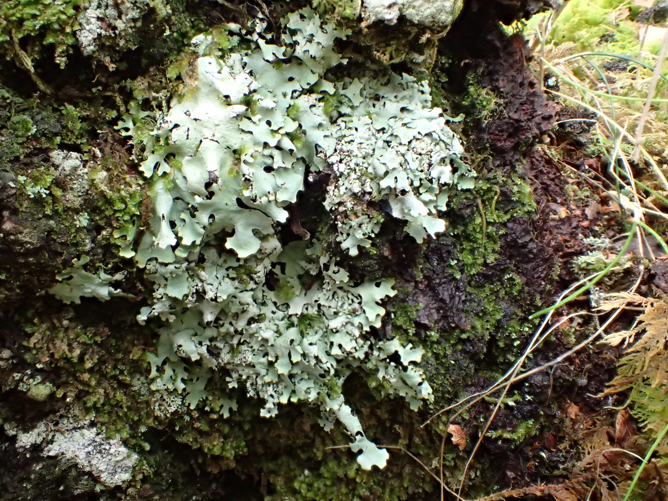 The slope above was a struggle with vegetated scree and lots of brambles which drew blood. Here the trees were mostly oak and birch plus a few rowan. Most of the oak didn’t have much to be seen which was perplexing. Eventually we had Platismatia glauca on a blown down stick – in an oak wood this should be plentiful. Then a better oak had the first Thelotrema lepadinum (old woodland species) of the day, plus Micarea stipitata with pale white-pink stalked pycnidia over moss. Hypotrachyna taylorensis on a birch was nice to see.