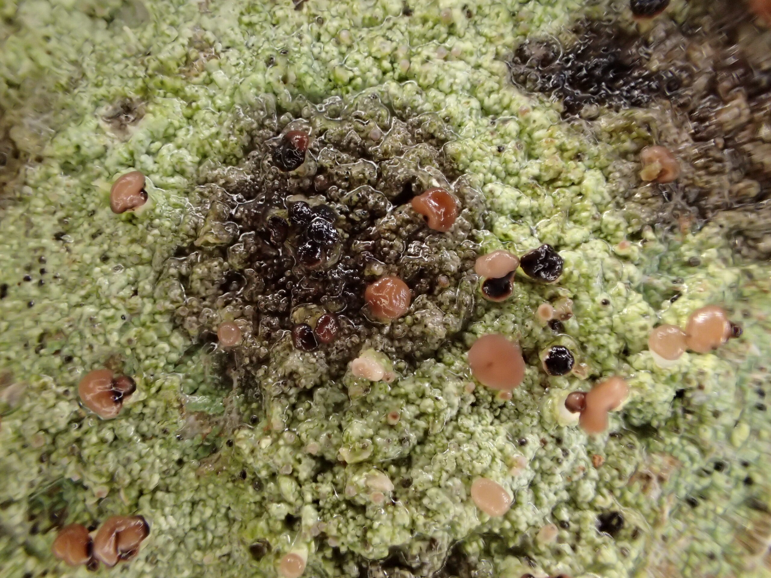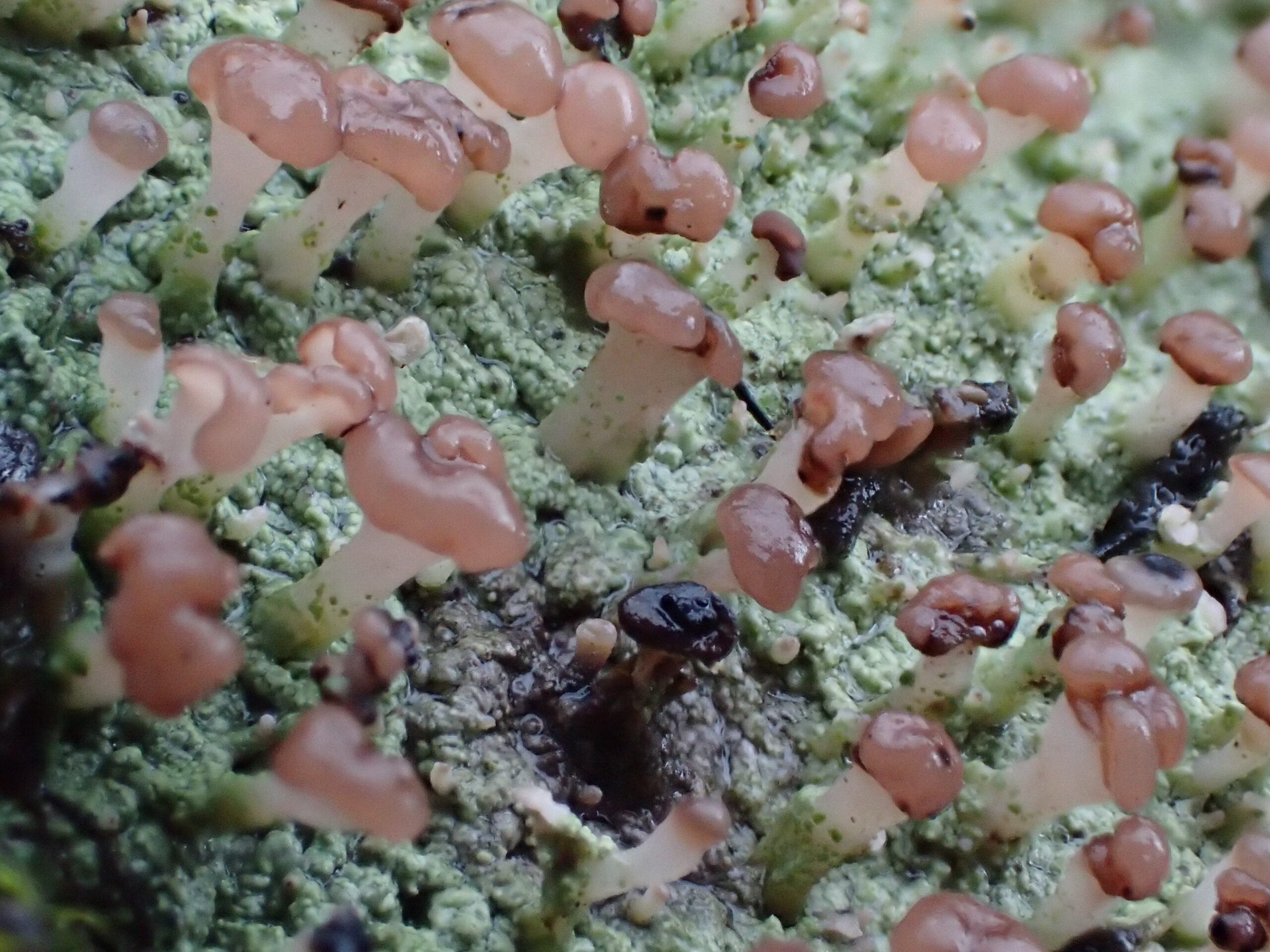 A final find in the dusk as we were heading back to the carpark was a lovely large patch of Baeomyces rufus on a rock. On closer examination we saw discoloured areas and some of the pink-brown stalked apothecia of the B rufus were blackened with possible pycnidia visible. This might be a lichenicolous fungus, a likely candidate being Arthrorhaphis grisea.