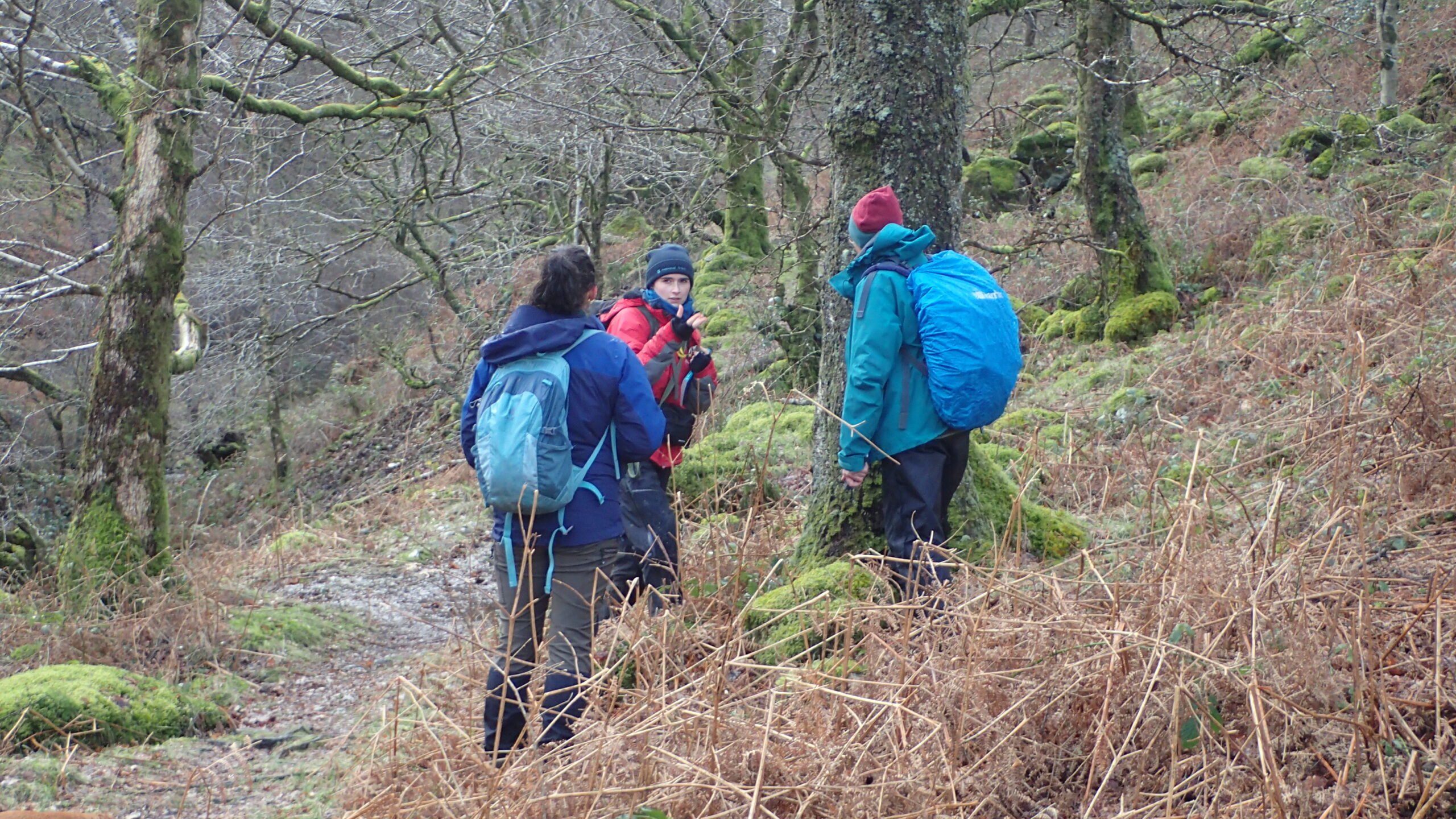 We met at the National Trust Bowderstone carpark on a chilly but, thankfully, mostly dry day. A brisk walk into the main monad containing the woodland warmed us up to start with. Kerry, the organiser, had told us about good lichens on an ash, seen on an earlier visit, so we headed to that grid ref first.