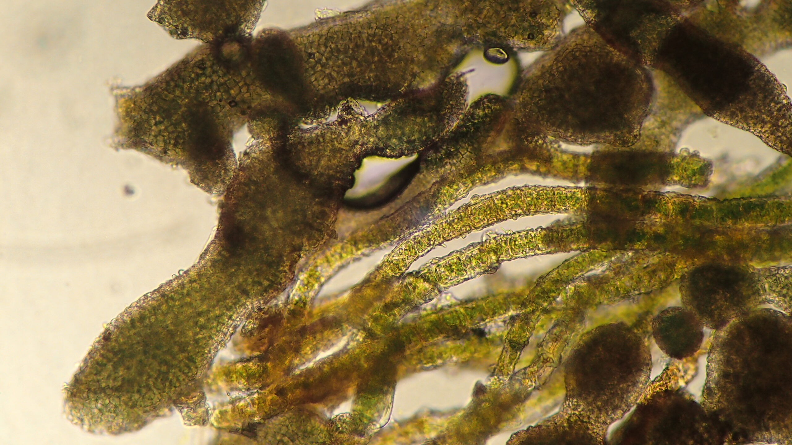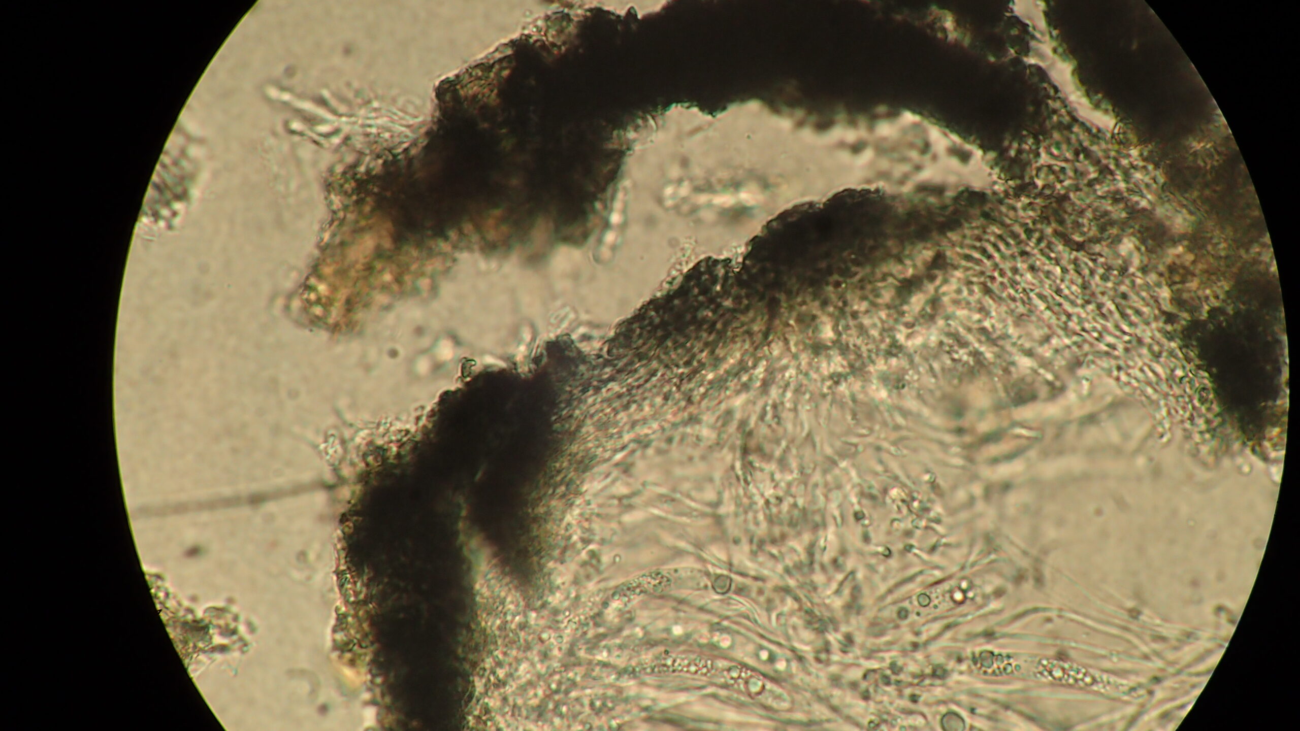 Two old ash a few metres apart on a bouldery NE-facing slope appeared pollarded, though it might have happened naturally by the upper part breaking off – one was quite ragged at the top. Kerry had reported Sticta and Peltigera horizontalis, growing on the first ash and on the rocks too. Indeed there was copious Sticta sylvatica, with young lobes also on the adjacent hawthorn and elm. This ash tree also had tiny flat orange apothecia which turned out to be Gyalecta truncigena when Chris looked at the specimen under the microscope – muriform spores with the right number of cells. The second ash had Peltigera praetextata and a sward of a tiny jelly lichen amongst bryophytes. We took a small specimen as it was too moist to see properly in situ, thinking it might be Scytinium teretiusculum, but once dried out it was blue-grey not brown with no underlying lobes and had a photobiont other than Nostoc. It’s as yet unidentified but may be the rare Leptogidium dendriscum, not seen in Cumbria since 1988.