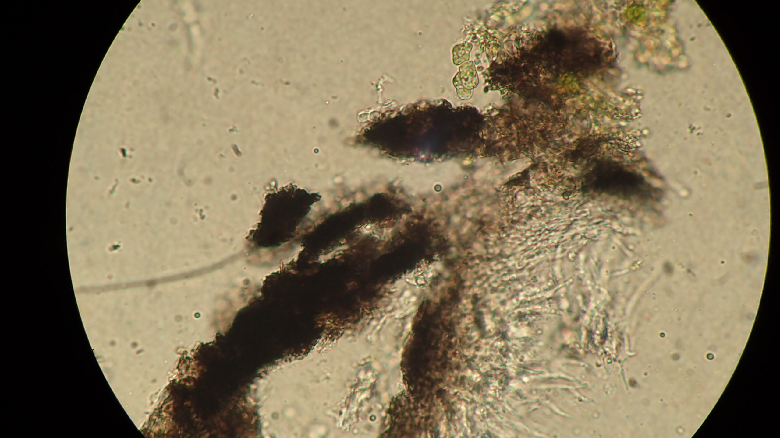 We crossed the beck where there were more ash trees and a couple of mature holly. Here the holly had lirellate crusts and some deep green areolate thalli with dark perithecia. Spores confirmed Porina genus, followed by wrestling with involucrellum colour in water then KOH – was there purple or grey pigment? The eventual conclusion was that we had both P byssophila and P borreri. Hawthorn beside the beck had the only Xanthoria parietina and Physcia tenella that we saw during the visit.